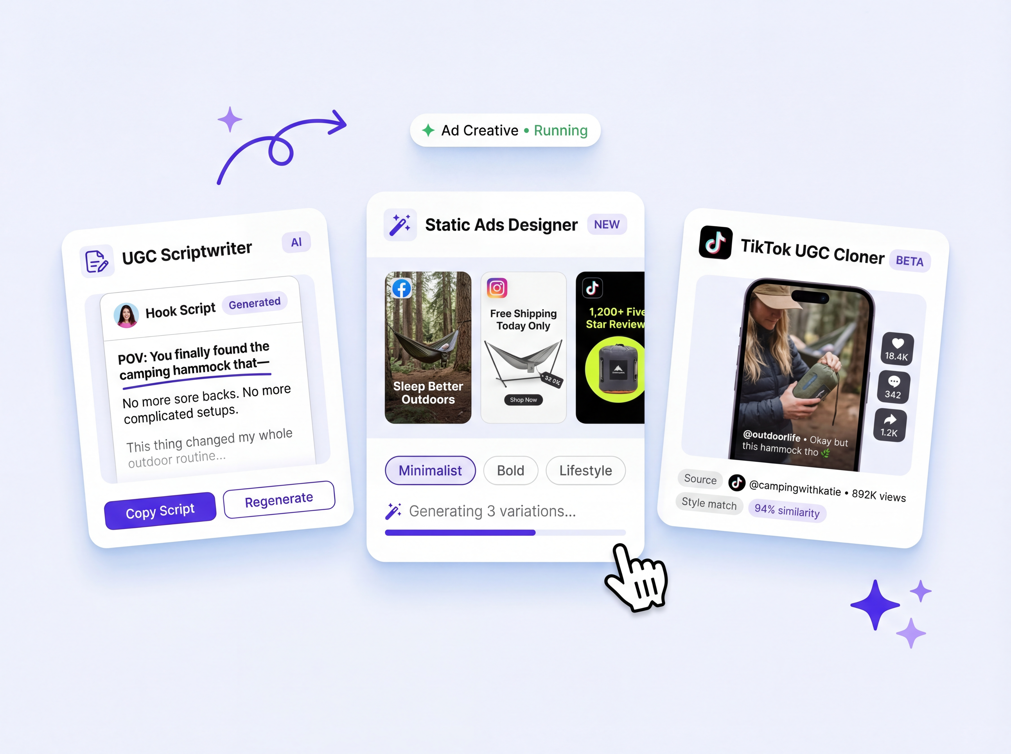 Turn your research into ready-to-run ad concepts. From creative strategy to UGC scripts, video production, and static ad design. Your entire creative pipeline from insight to asset.