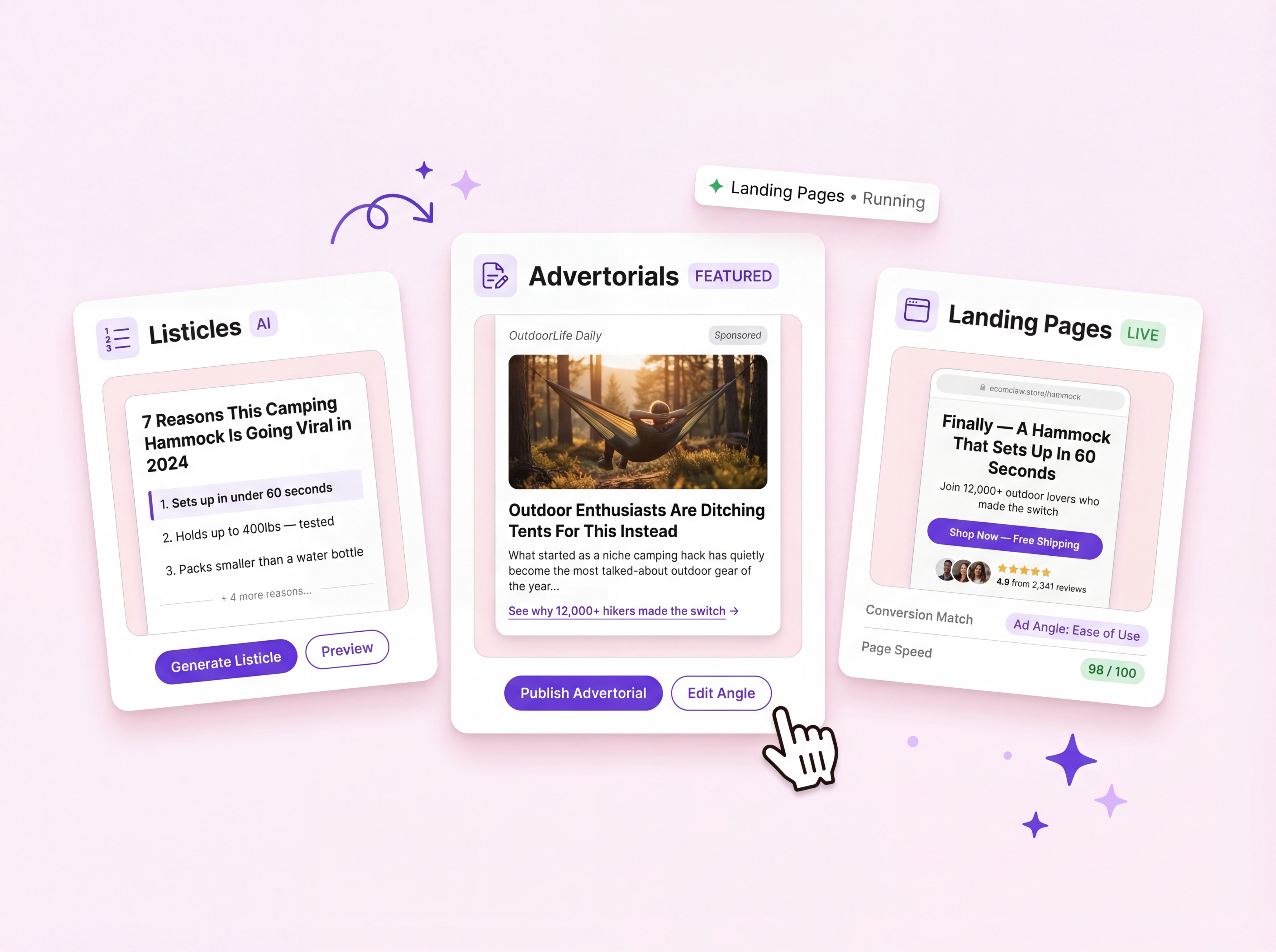 Generate landing pages that match your ad angles for full funnel congruency. From listicles to advertorials, every page is built to convert the exact traffic you are sending to it.