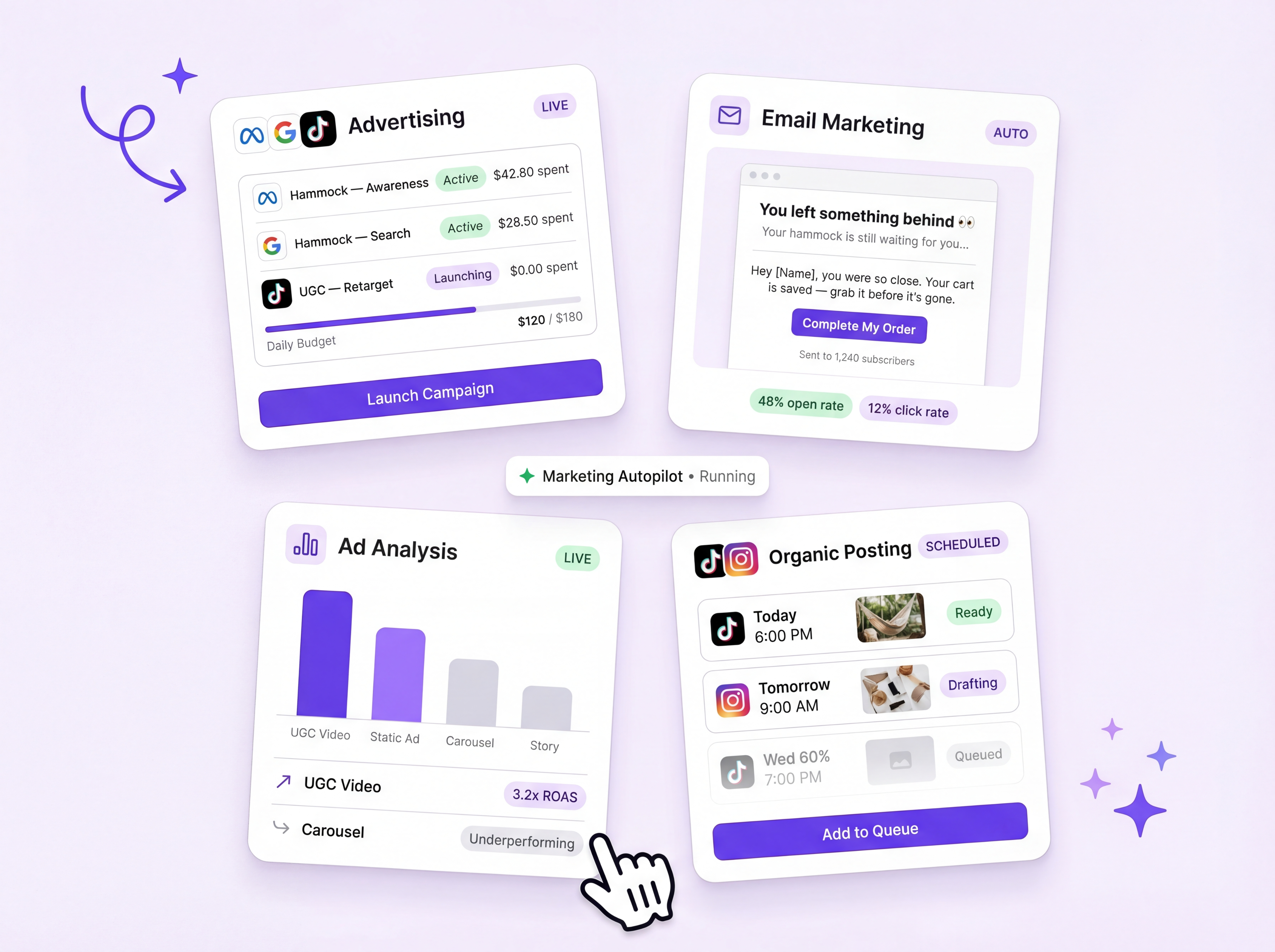 Run your entire paid and organic marketing from one place. Launch ads on Meta, Google, and TikTok. Send email campaigns. Analyze ad performance. Post organic content. All automated.