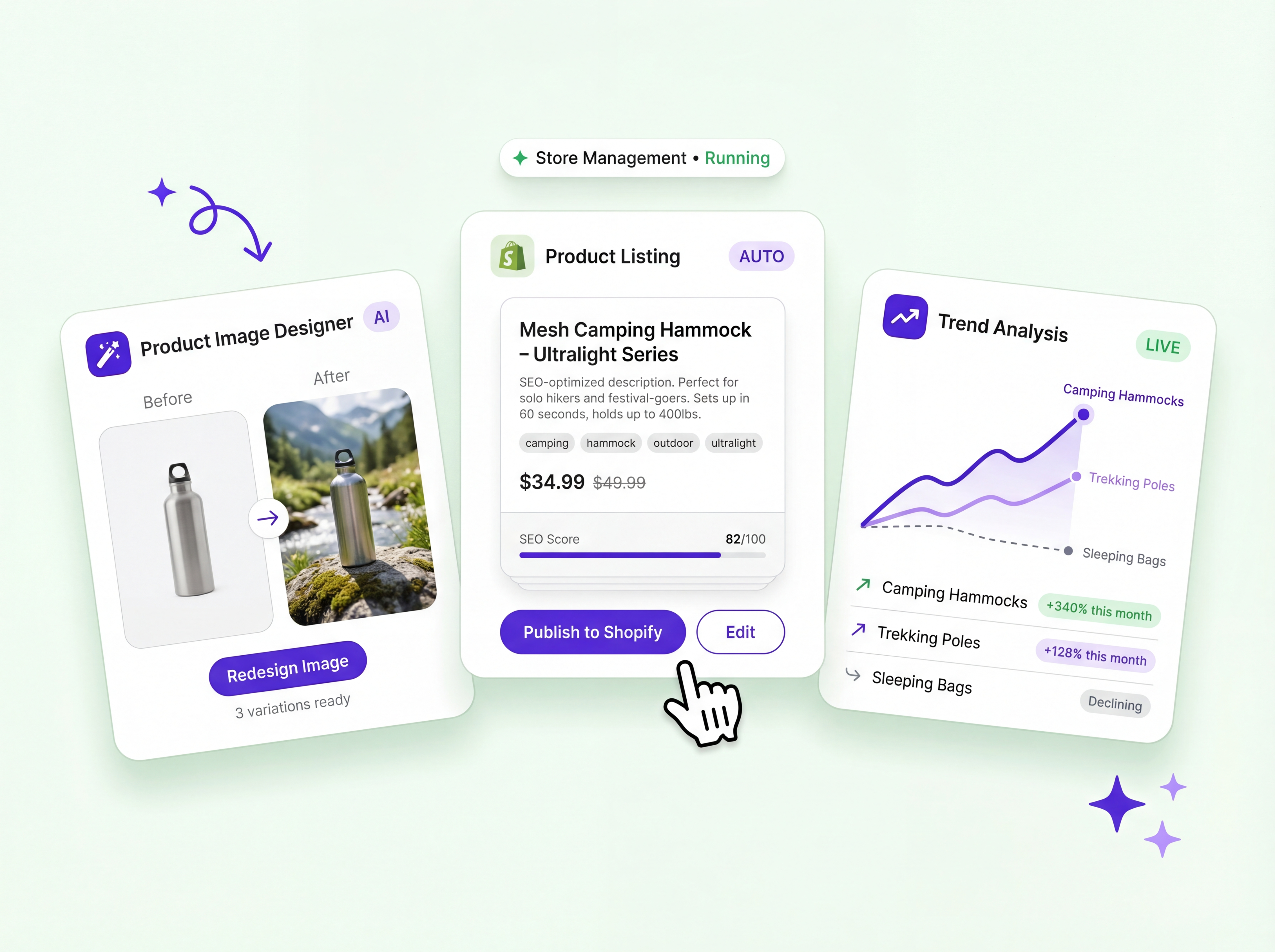 Manage your entire Shopify store hands-free. Design product images, create optimized listings, and track trending products in your niche. Your store stays fresh without you lifting a finger.